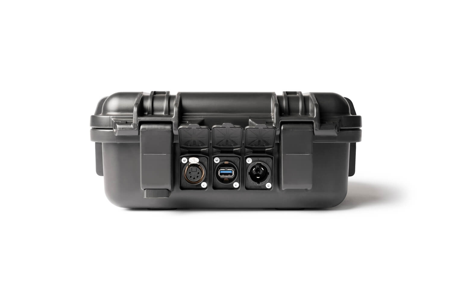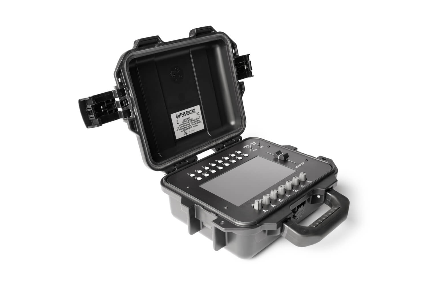 Spots Unlimited’s Gaffers Control is a compact, portable DMX console housed in a water-resistant StormCase. Weighing only 6 pounds and offering 14 addressable banks (512 DMX addresses), the unit features a 7” capacitive touchscreen, integrated LumenRadio CRMX transmitter, integrated 70Wh battery providing up to 10 hours of operation, and a built-in DMX library for a wide range of manufacturers.