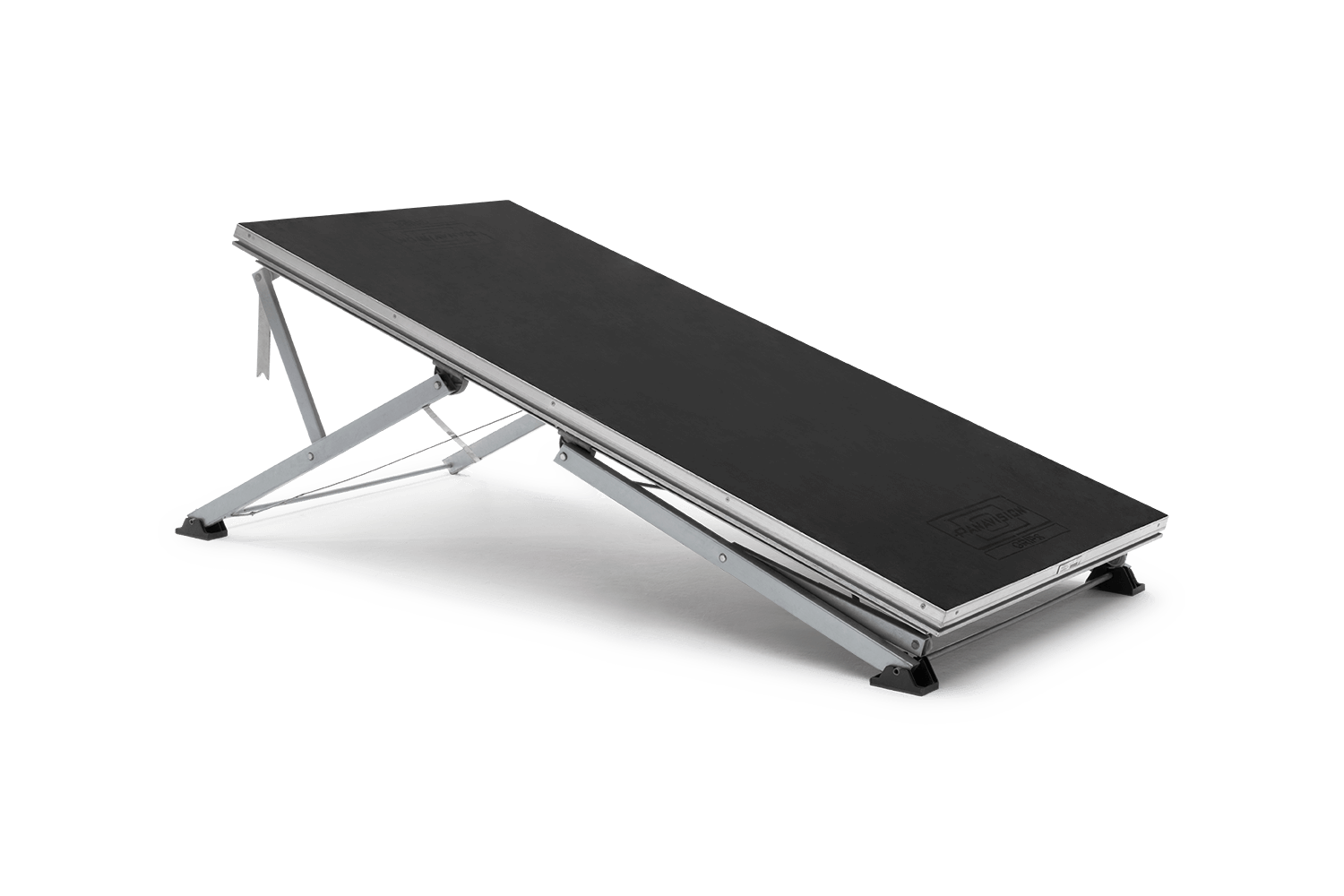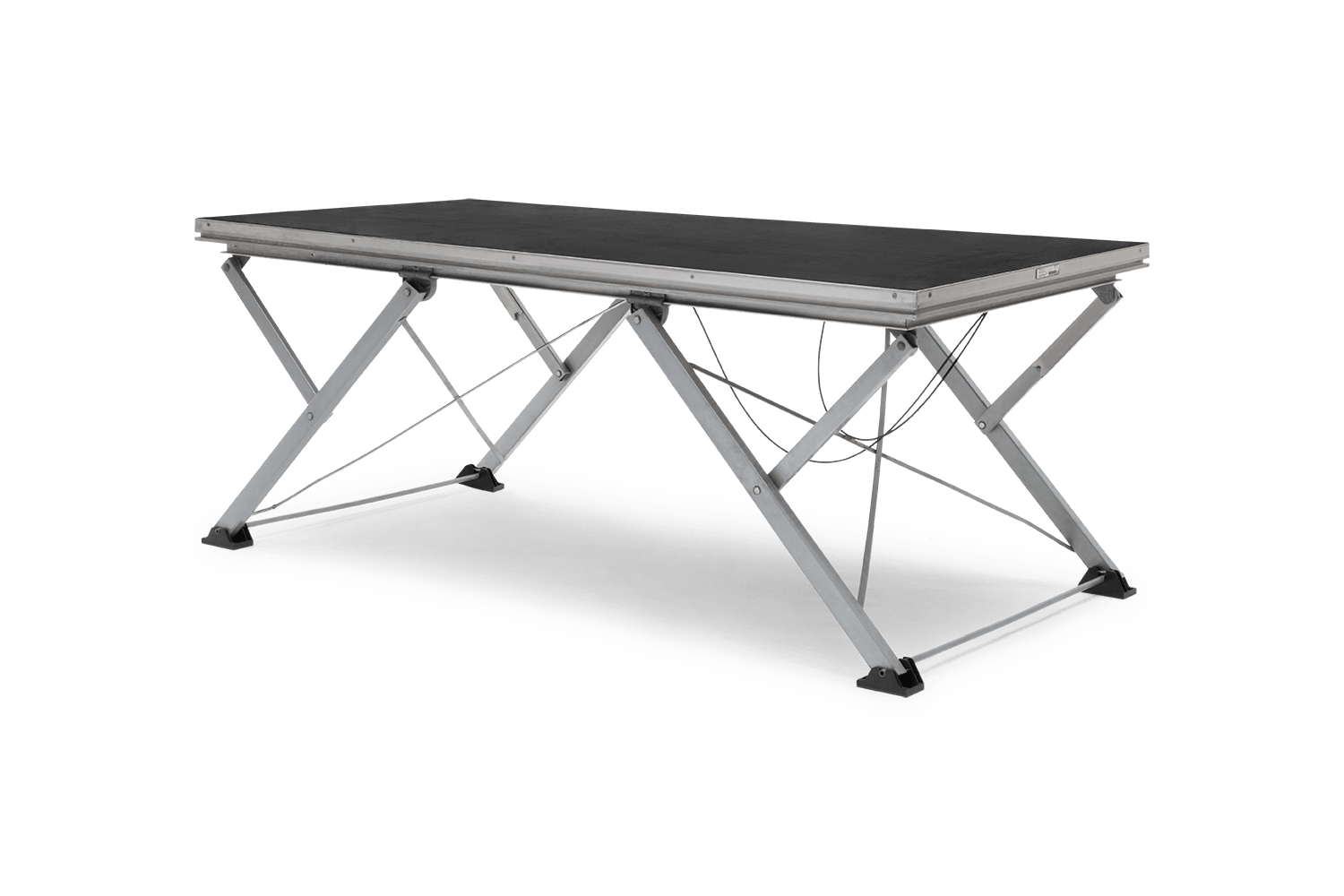 Featuring adjustable legs that can be set to varying heights without the need for any rigging, these multifunctional platforms can be used as ramps or flat tops.