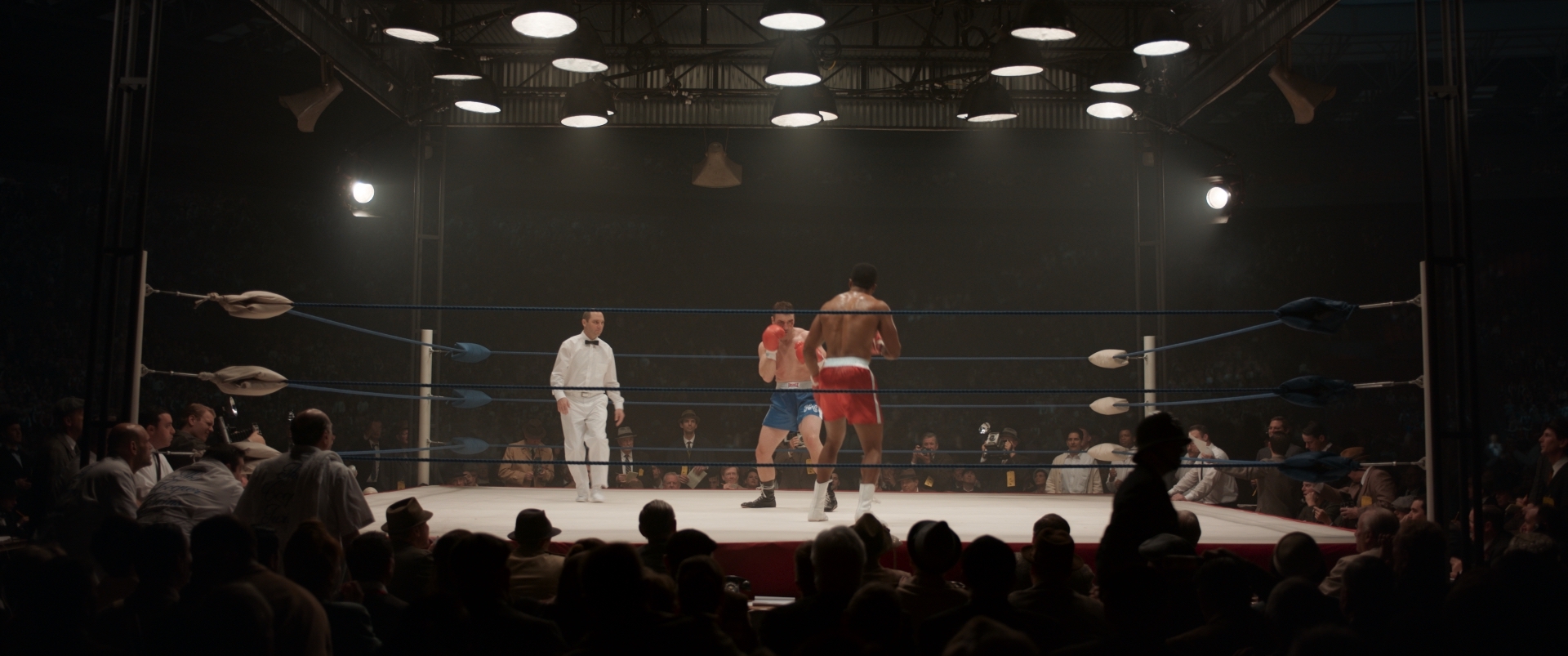 Throughout the movie, the white point often tips to the warm side of the scale. The filmmakers took care, however, to ensure that certain elements, such as the white on Clay’s boxing trunks, remained crisp and clean. “The fight scenes skewed a little bit more towards the magenta warmth as opposed to the more yellow warmth of the rest of the film,” Vertovec explains. “We wanted to make sure the mat of the boxing ring had a nice, aged quality to it and wasn’t too bright or dark. There was also an effort to make sure the flashes from the camera didn’t feel overwhelmingly yellow or blue.”