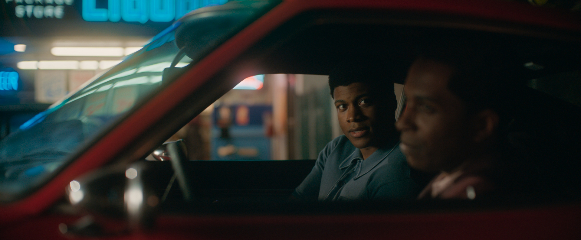 She adds that she and her collaborators worked with “vibrant blues and really warm interiors” to imbue the images with the feeling of the real Miami. The palette was also punctuated with pops of red, evidenced in Cooke’s sports car and Clay’s boxing gloves. When it came to the final color grade, Vertovec explains, the LUT served “to keep those colors under control so they could go to an HDR display and not feel electronic or digital or out of gamut.”