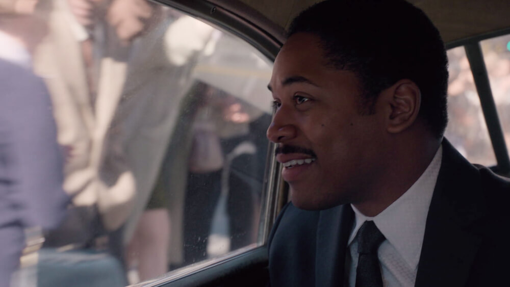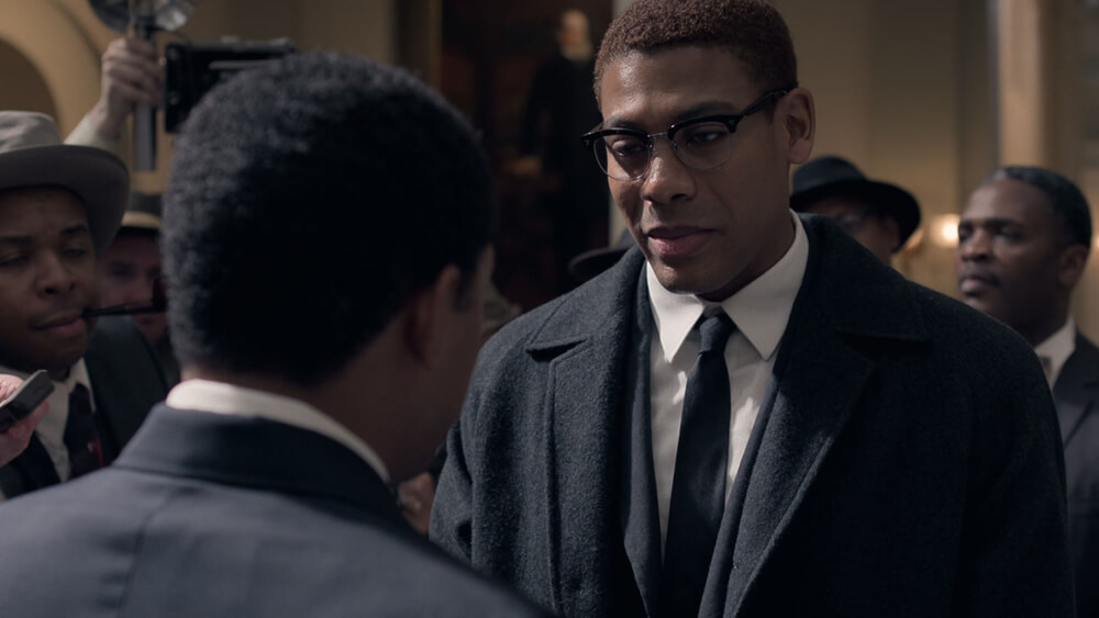 In the post-war years of 1947-1959, film-stock technology rocketed, and Kodachrome became the signature of Life magazine and the photography of the time. Bright, clear colors, skin tones and clothing details were well-defined, and the shadows were now a deep navy blue. The war was over, and we sought to capture the flamboyance and relief with more color, camera movement, and joy expressed through costume and lighting — front-lit flash photography and warm tungsten streetlight and home lighting. We let the shadows fall away to allow the story to be clandestine in Malcolm’s world and to underscore the private drama unraveling in MLK’s life at home and at church.
