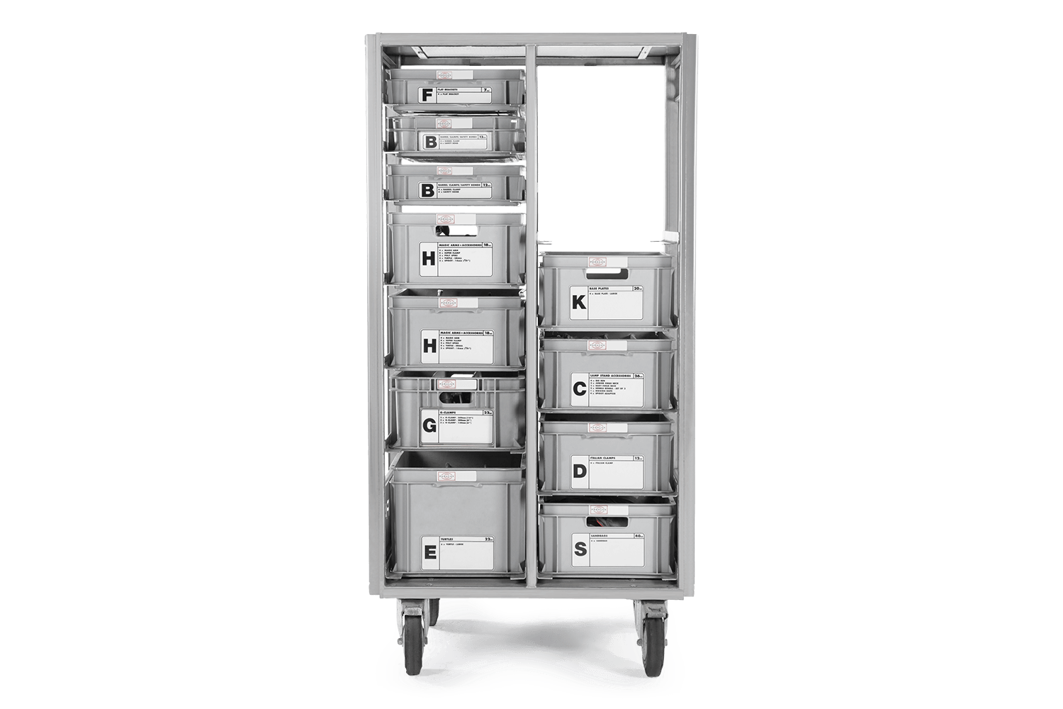 Made by Panalux and designed to fit neatly in the back of a lighting truck, Red Racks are a modular trolley system available in a variety of configurations to meet a crew’s specific grip and mounting needs. The Red Rack 2 is tailored to all-round mounting solutions, featuring clamps and grips in a variety of shapes and sizes to attach to rigs on location or in the studio. The perfect supplement for tight spaces or tricky rigging situations.